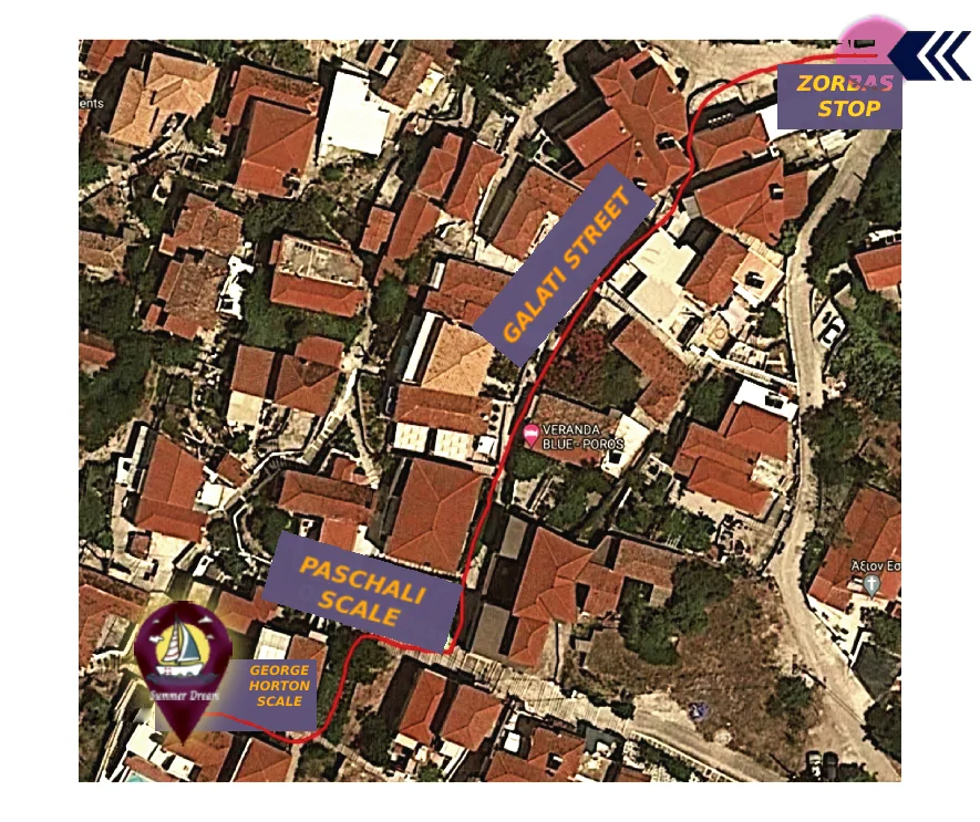 Δείτε εδώ την βιντεοσκοπημένη διαδρομή από την αποβίβαστη στη στάση “Ζορμπά” μέχρι την προσέγγιση του Summer Dream. Η πορεία ακολουθεί τα χαρακτηριστικά μονοπάτια και τις κλίμακες του Πόρου και η διέλευση είναι μόνο για πεζούς.
