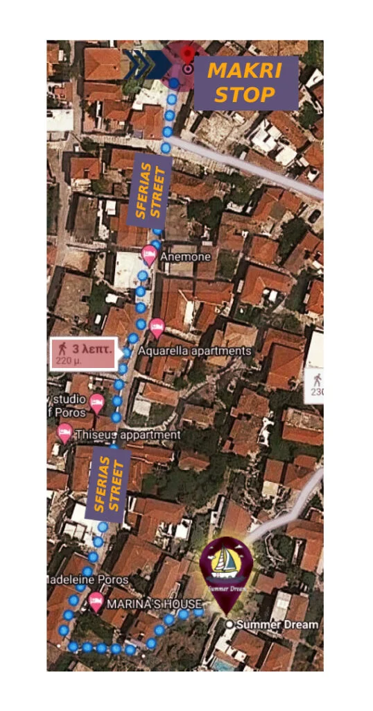 Δείτε εδώ την βιντεοσκοπημένη διαδρομή από την αποβίβαστη στη στάση “Ζορμπά” μέχρι την προσέγγιση του Summer Dream. Η πορεία ακολουθεί τα χαρακτηριστικά μονοπάτια και τις κλίμακες του Πόρου και η διέλευση είναι μόνο για πεζούς.